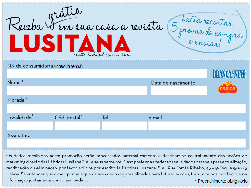 Receba a Revista Lusitana sem custos, através do envio de 5 provas de compra de qualquer produto Branca de Neve ou Espiga e preencha o formulário (ou escreva os dados pedidos).
