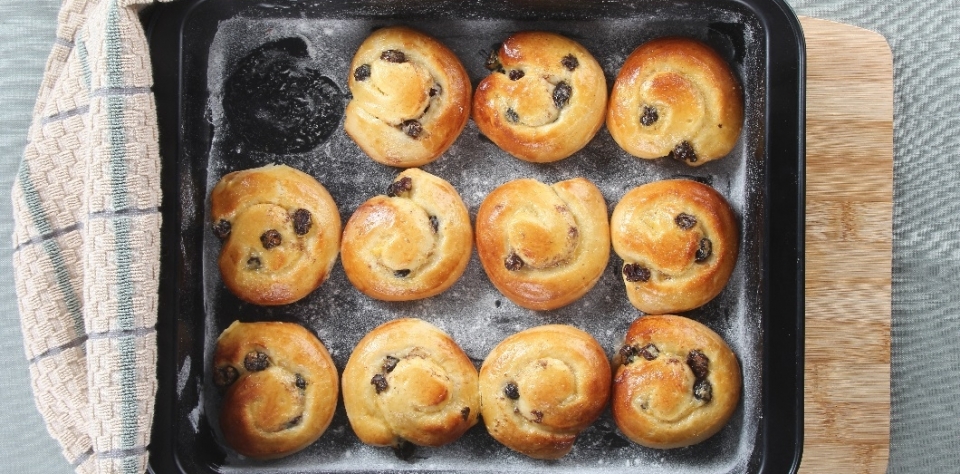 4Sobre uma superfície polvilhada com farinha, tenda a massa em forma de rectângulo, com 25 por 20 centímetros. Barre-a com o creme e polvilhe com a canela e os corintos. Enrole a massa sobre o recheio e corte em 12 rodelas.